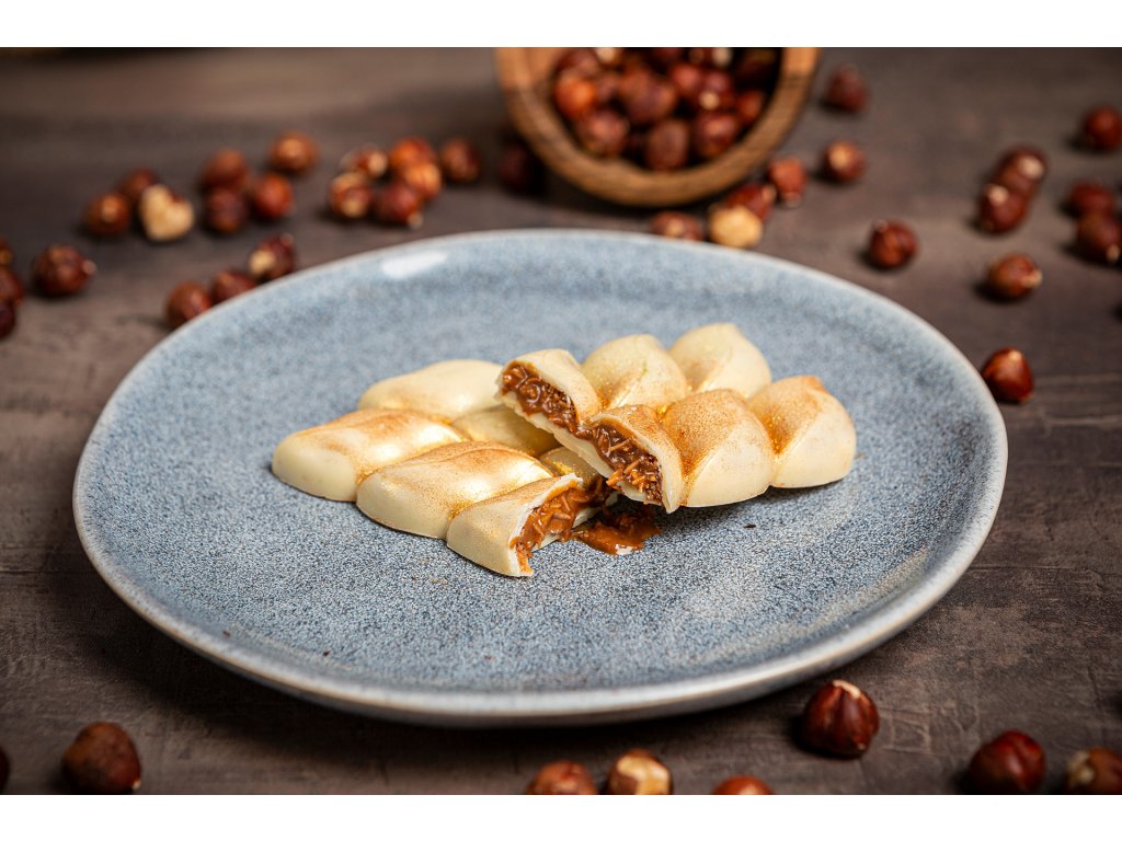 Krém: 100% lísko oříšková pasta, 31% bílá čokoláda, kadaif (pšeničná mouka, voda, kukuřičný škrob, přírodní sójový lecitin, sůl), máslo