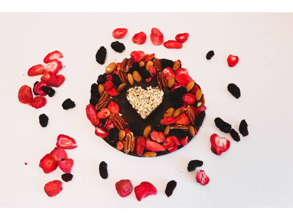 Ovocem a ořechy zdobený koláček z hořké 72% čokolády s mléčným srdíčkem plněným nugátem! Srdíčko je posypáno drcenými lískovými oříšky.